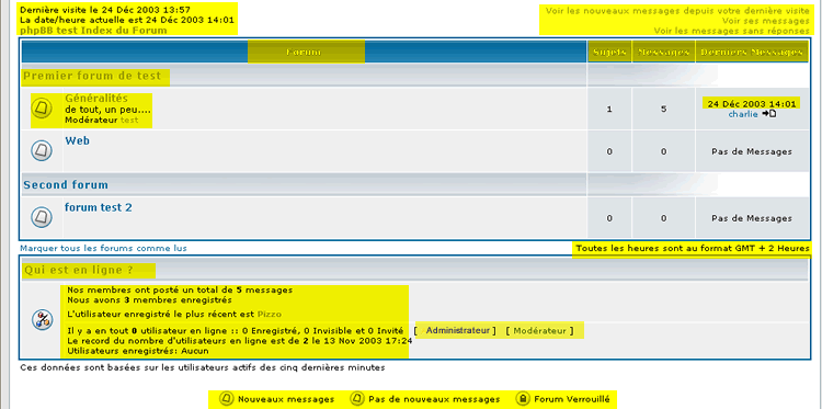 Le menu principal : comment le modifier ? Titre et Description : comment les modifier ? Le logo :  Comment le remplacer, le déplacer ? Comment modifier les couleurs Administrateur et Modérateur Où trouver ces lignes ? Où trouver ce titre ? Où trouver ces titres ? Où trouver ces lignes ? Comment modifier le format de date / Heure ? Comment modifier le format de date heure ?