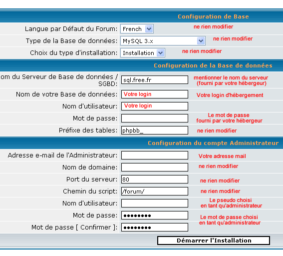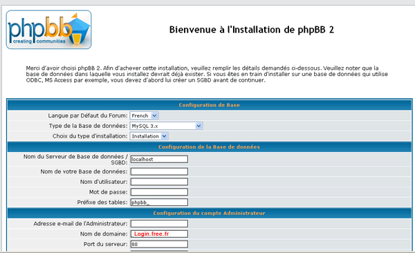 Préfixe des tables : phpbb_ par défaut (vous pouvez