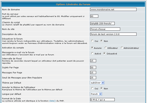 les inscriptions - Activation du compte : Messagerie E-Mail, Intervalle de flood, Sujets et Messages par Page sont suffisamment explicites pour n'avoir pas à être commentés. Thème par défaut : Si vous avez installé plusieurs "thèmes" (skins), vous choisissez ici quel est le thème affiché à l'inscription. L'utilisateur peut toutefois en choisir un autre dans son profil. Annuler le thème de l'utilisateur : consiste à remettre le thème par défaut à tous les utilisateurs (important en cas de suppression d'un thème par exemple..) Langue par défaut : Tout comme pour le thème, le language à l'inscription se détermine ici. L'utilisateur peut toutefois choisir la langue anglaise (mais ce choix n'influera que sur la présentation du forum, mais non son contenu, bien évidemment...) Format