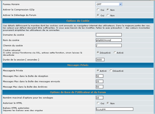 Fuseau horaire : Tout comme pour l'heure, vous allez afficher ici le fuseau horaire du forum. Toutefois, les utilisateurs peuvent modifier également cette donnée dans leur profil. (voir plus d'explications ici) Activer la compression Gzip : ne pas activer cette option Activer le délestage du forum : le délestage est la suppression des posts et messages à intervalles réguliers et choisis par vous. Options du Cookie Domaine du cookie : Cette case est renseignée lors de l'installation du forum. Toutefois elle peut être modifiée lors d'un changement d'hébergeur, s'il n'y a pas une nouvelle installation . Il faut donc mentionner ici le domaine du cookie qui est celui de votre hébergeur (voir nom de domaine plus haut). Parfois et selon l'hébergeur, cette case doit rester vide (faire des tests si le cookie n'est pas accepté et oblige à une reconnexion systématique). Attention ! ne jamais mettre le http:// dans le domaine du cookie Nom du cookie : par défaut, lors de l'installation, il est porté phpbb2mysql. Nous ne saurions trop vous conseiller de changer ce nom par un autre peu usité, ce qui peut éviter des conflits notamment lorsqu'un user visite plusieurs forums phpbb... Vous pouvez mentionner n'importe quel nom de cookie, c'est sans importance ! (trucmachinchose peut très bien faire un nom de cookie !) Evitez toutefois d'y inclure des signes de ponctuation ou des espaces: le cookie ne serait pas "reconnu"... Chemin du cookie : lors de l'installation il est mentionné / (ne pas le modifier mais ... ne pas le supprimer ! ) Cookie sécurisé : ne pas cocher. Durée de la connexion : Ici est mentionnée la durée normale d'une session utilisateur. au-delà l'utilisateur, en train de rédiger un texte par exemple, verra apparaître un message : invalid session. Vous pouvez donc modifier le nombre initial pour l'augmenter un peu. Messages privés Messagerie
