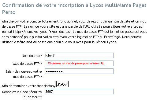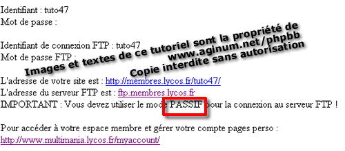 Choisissez un nom de site pour le transfert FTP (ici j'ai choisi le même que celui d'inscription, mais il peut, bien sûr, être différent) Précisez un mot de passe et confirmez. Vous recevez ensuite un mail vous confirmant vos identifiants: 1. votre nom de membre, et le mot de passe associé, 2. Votre identifiant de connexion FTP et le mot de passe associé. 3. L'adresse de votre site. 4. L'adresse FTP FTP : File Transfer Protocol ou en français Protocole de Transfert de Fichiers Enfin, l'adresse pour accéder à l'espace membres..