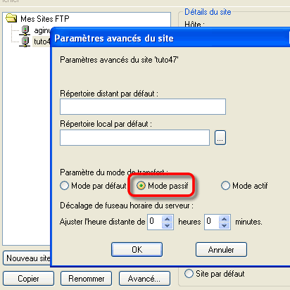 Cliquez sur Avancé et cochez la case Mode passif. Répertoire distant par défaut. Chez certains hébergeurs,