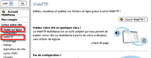 Lycos vous fournit également un FTP qui vous permet de vous connecter directement à votre espace, mais nous ne le conseillons pas. Outils en ligne >> WebFTP