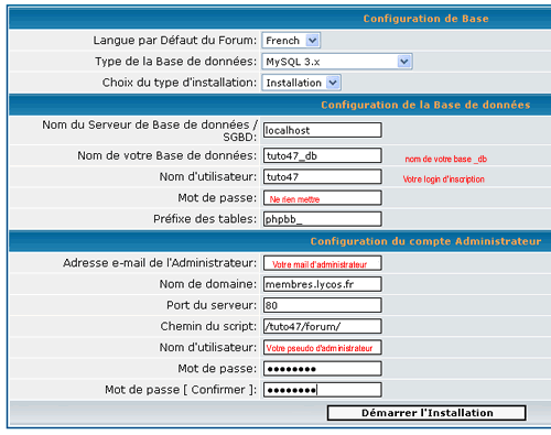 Lancez l'installation en tapant l'adresse de votre forum dans le navigateur. Ici ce sera : http://membres.lycos.fr/tuto47/forum/ Vous devez voir apparaître cette page