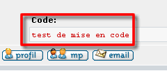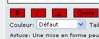 Code : Modifie les mises en code dans les posts: Couleur, taille et type de police, Left = gauche Quote : Modifie les mises en citation dans les posts Couleur, taille et type de police, |